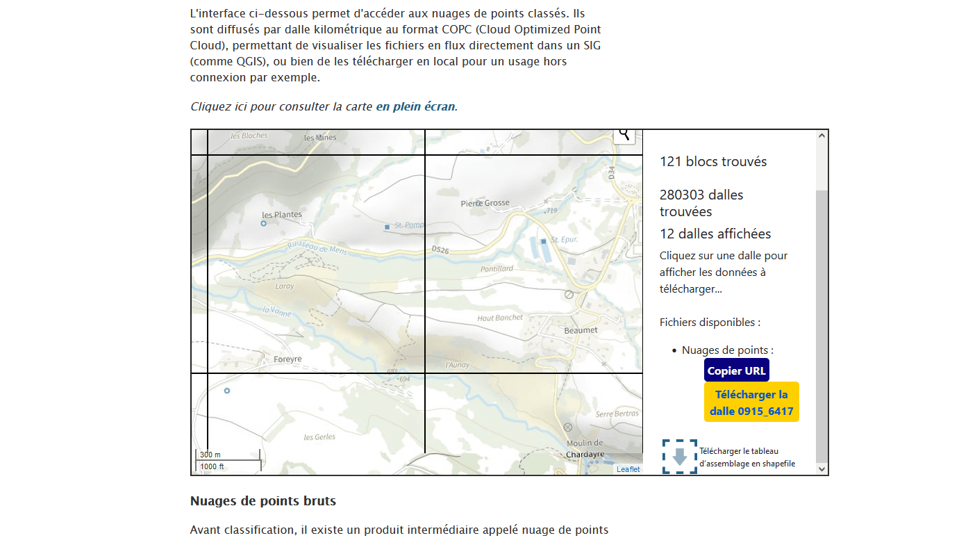 Interface de téléchargement des tuiles LIDAR de l'IGN