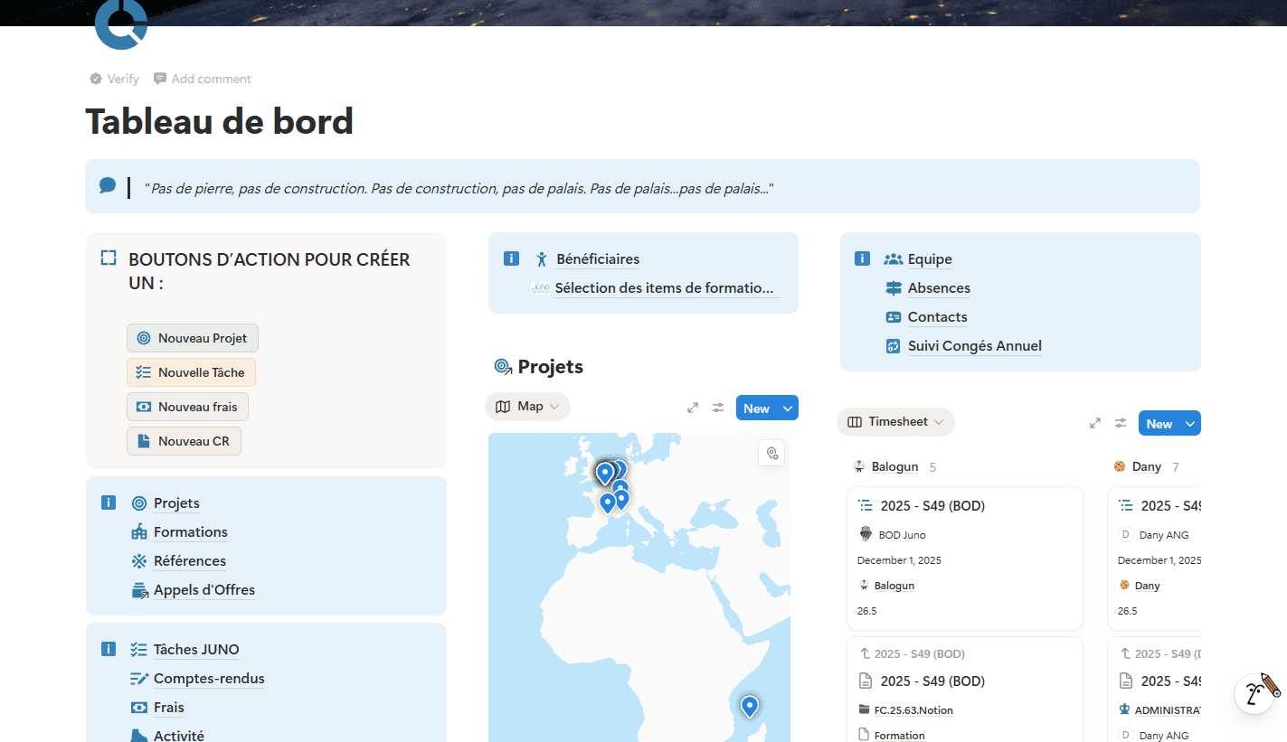 À l'Atelier Juno, nous utilisons Notion au quotidien pour piloter l'ensemble de nos missions architecturales et BIM. Depuis plus d'un an, cet outil est devenu la colonne vertébrale de notre organisation : gestion des clients, suivi des projets, coordination des tâches, documentation des missions.