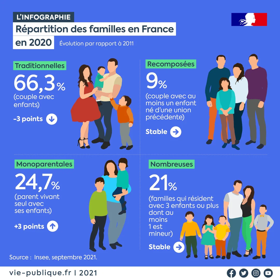 Augmentation des familles monoparentales : Les familles monoparentales représentaient 24,7 % des familles en 2020, contre 8,5 % en 1975 (INSEE).